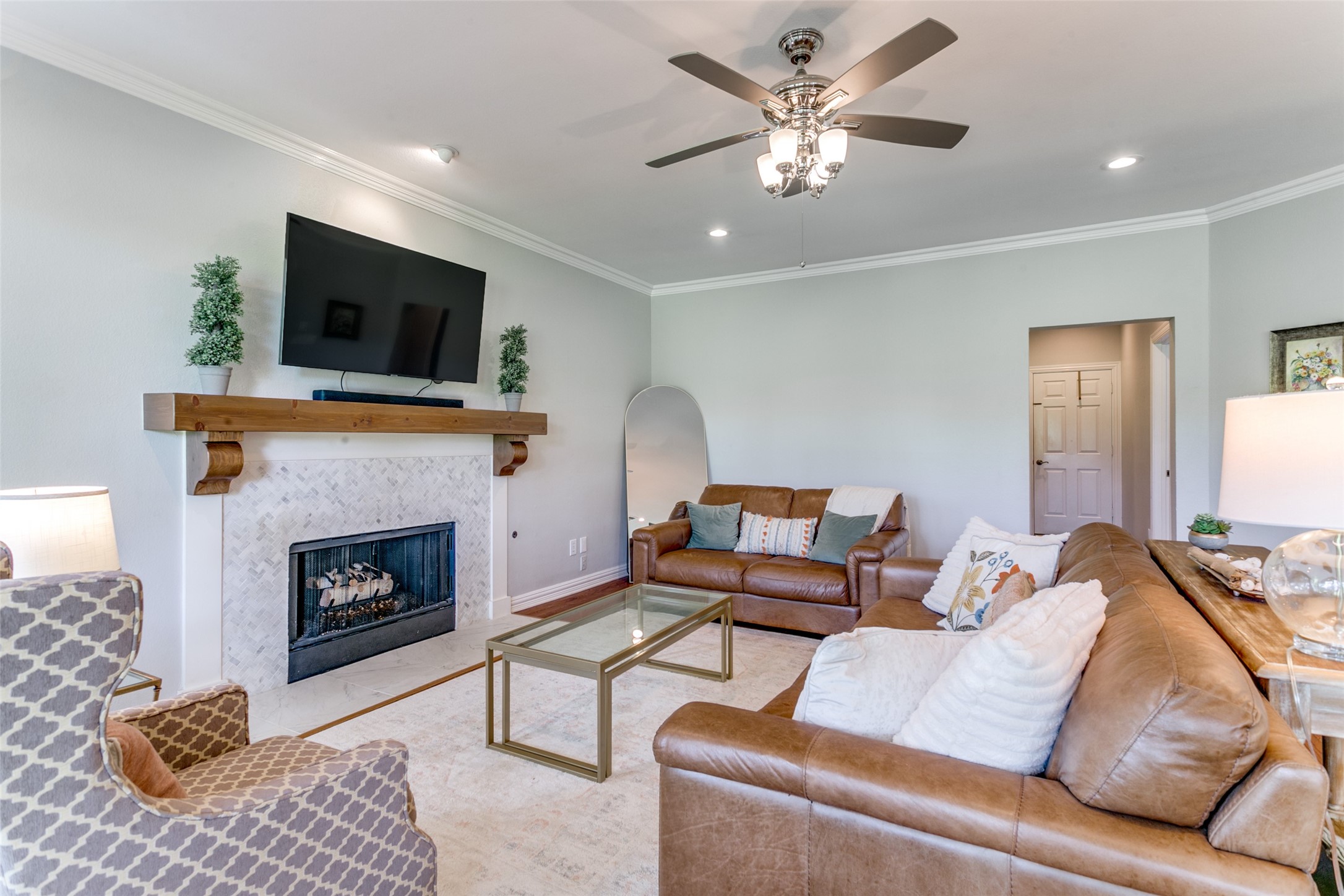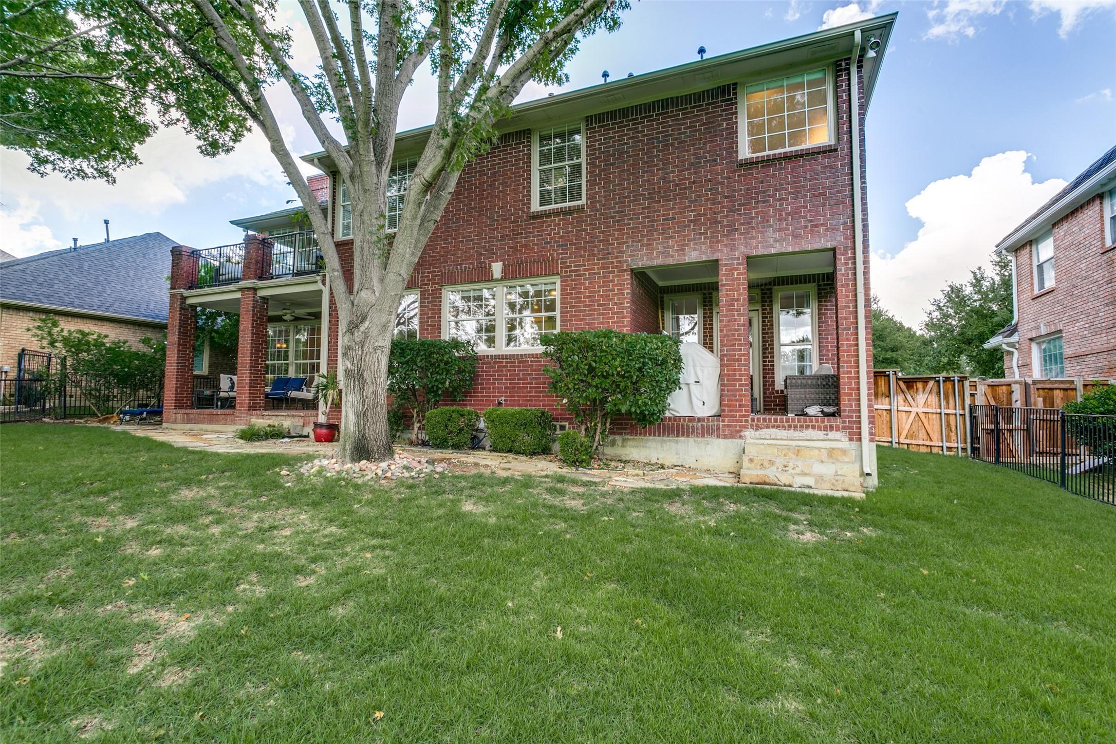 Situated on the picturesque 7th fairway of the exclusive gated golf course community of Hackberry Creek, this remarkable home offers a grand entrance adorned with magnificent soaring ceilings that lead to exquisite hardwood flooring throughout. Recently renovated to incorporate modern conveniences, this pristine residence showcases breathtaking views of the golf course. The home features an open floor plan, wood floors, designer and recessed lighting, while the kitchen is equipped with granite countertops, beautiful marble backsplash, stainless steel appliances and a window by the sink. Adjacent to the kitchen is family room complete with gorgeous fireplace and French door leading to the covered back patio. Additionally, both formals and a guest bedroom with a Murphy bed are on the main level, making this a perfect floor plan. Upstairs is the master suite and its accompanying bath, this is the epitome of luxury, offering an unparalleled level of comfort, space and cavernous closet As a bonus, enjoy morning coffee on the balcony off the master suite that looks over the golf course. The second floor game room with French doors is flexible for a myriad of uses, think quiet game or play room, over flow for guest room, exercise room, third living room, the options go on. The backyard is a perfect retreat, offering a delightful patio setting nestled on a treed lot boasting sweeping views of the lush golf course. Hackberry Creek is eligible to apply for Coppell ISD Open Enrollment Program. Yard care is included with the rent.
